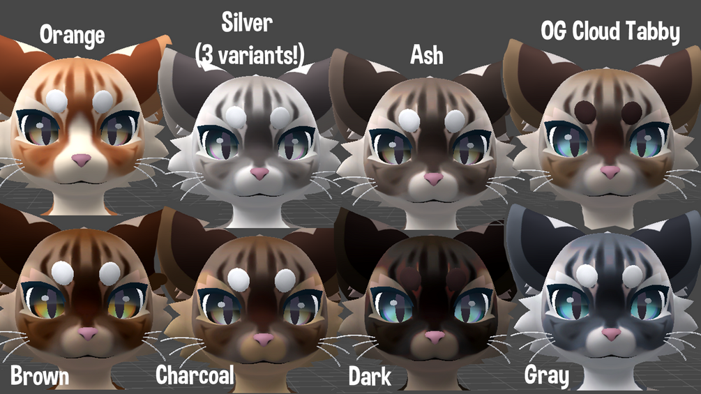 8 + 2 variants of Realistic Tabby Textures for the Mayu base model. This includes 2 texture pngs per skin, one for the body and one for the head. Requires the Mayu VR model to use, of course, as it is not included- this is only textures.